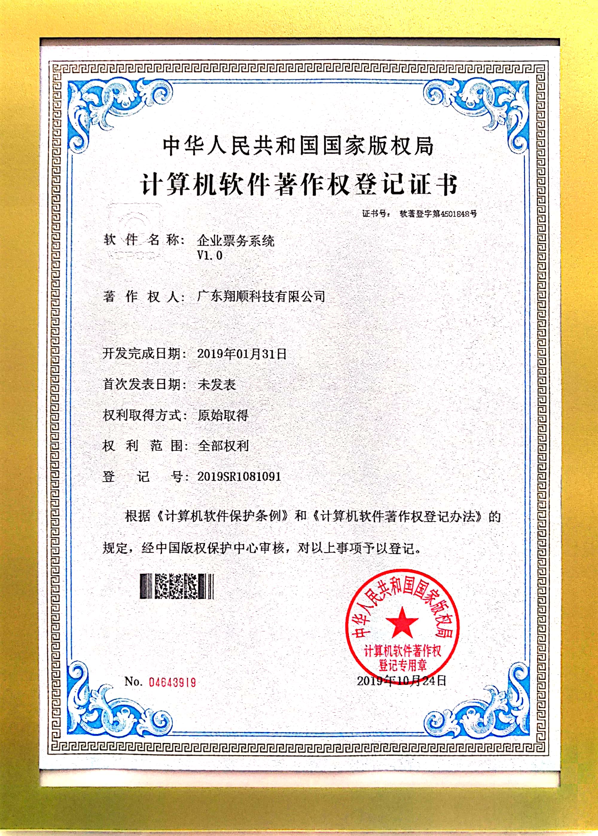 企業票務系統著作權登記證書
