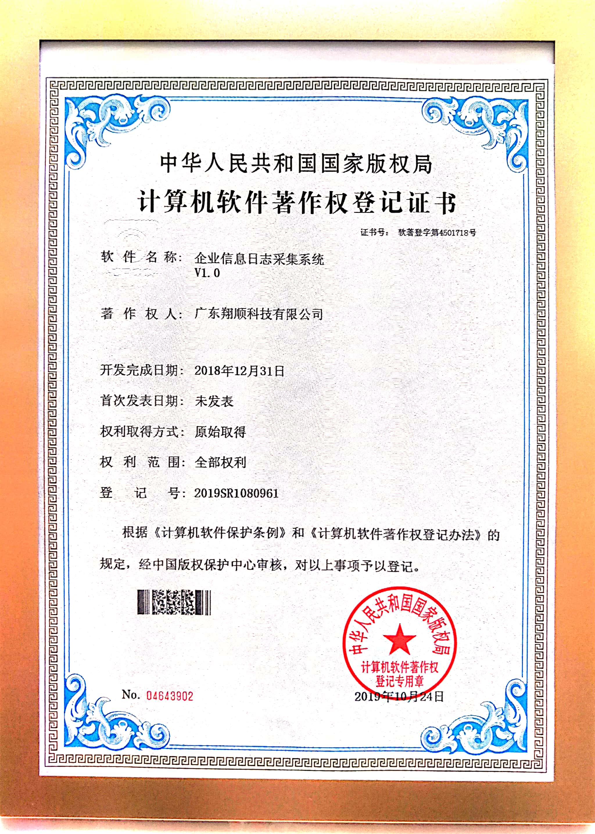 企業(yè)信息日志采集系統(tǒng)著作權(quán)登記證書