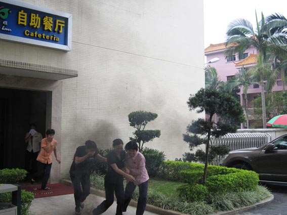 講解后,各部門人員按照方案要求到各區域就位。溫泉部、客房部、餐飲部員工扮演客人分別到北樓各樓層客房中等待疏散。由保安部人員用香煙引響消防警鈴,消防控制室當班人員立刻到控制室了解著火點位置,并呼叫當班保安人員到著火點查看,模擬發現火情難控制后,立即呼叫滅火行動組人員緊急滅火,并通知前臺。前臺立即用對講機呼向各部門報告著火地點,啟動火警區域的緊急疏散,并立即呼叫119增援。各樓層立即組織客人疏散,只見員工紛紛迅速從樓層中逃出,彎著腰并用濕毛巾捂住口鼻,有序地沿著樓梯樓快速撤離到安全地帶。另一邊,辦公室、財務、保潔人員負責對逃出人員進行現場救助,并開展警戒及通道引導工作。