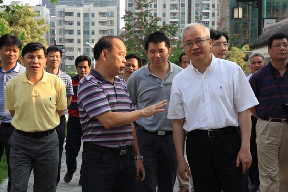 5月23日,廣東省住建廳廳長王芃一行在云浮市及新興縣有關領導的陪同下到筠州花園調研。左圖為集團總裁崔健平正在為王芃廳長介紹項目建設情況。