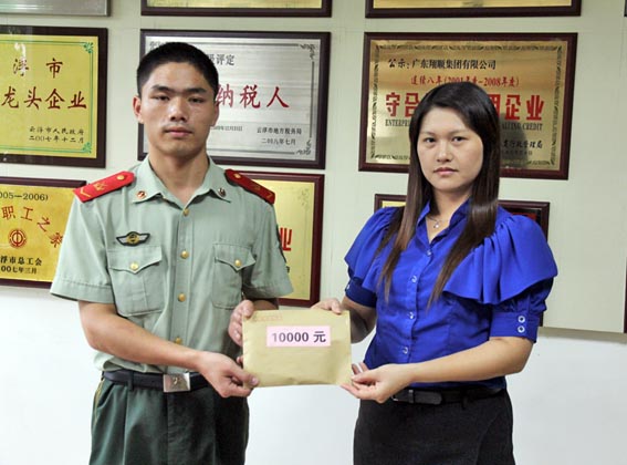 本報訊 在“八一”建軍節(jié)即將來臨之際,7月26日上午,集團向縣武警中隊贊助經(jīng)費1萬元,表達了我集團歷年來熱心支持地方部隊建設(shè)的情懷。右圖為集團辦副主任陳錦嫦代表集團在集團董事室向武警中隊官兵代表捐贈贊助金。