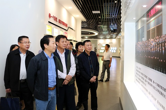 集團(tuán)工會(huì)主席崔仲昌(左三)陪同市工會(huì)領(lǐng)導(dǎo)參觀集團(tuán)文化展廳