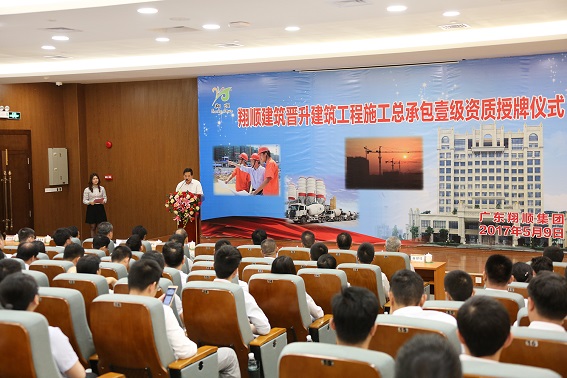5月9日下午,翔順建筑公司晉升建筑工程施工總承包壹級資質授牌儀式在集團總部辦公樓二樓演播廳隆重舉行,云浮市人民政府黨組成員、副市長鐘漢謀,云浮市住房和城鄉建設局局長謝月浩,新興縣人民政府副縣長何炳友,云浮市住房和城鄉建設局總工陳瑋,新興縣城鄉建設局局長潘耀才等市縣領導,以及集團全體管理人員共計260余人參加授牌儀式,共同見證“授牌”盛事。