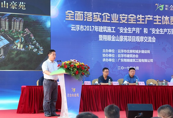 6月15日上午,云浮市2017年建筑施工“安全生產(chǎn)月”和“安全生產(chǎn)萬里行”暨翔順金山豪苑項(xiàng)目觀摩交流會在云浮市翔順金山豪苑項(xiàng)目隆重召開,云浮市政府黨組成員、副市長鐘漢謀,云浮市建設(shè)局相關(guān)領(lǐng)導(dǎo)以及翔順集團(tuán)、翔順建筑公司相關(guān)領(lǐng)導(dǎo)出席大會,云浮市內(nèi)300余名建筑行業(yè)代表參加大會。
