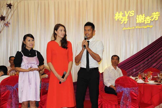 在眾人的期待中,6點15分,林丹謝杏芳十指緊扣步入宴廳的紅地毯。在主持人的熱情主持下,兩人向新興縣的父老鄉(xiāng)親問好致意。昔日在賽場上霸氣十足的“超級丹”在講話時卻顯得有些靦腆,讓大家看到了他的另一面。為表達對家鄉(xiāng)父老的謝意,林丹謝杏芳攜手到每桌敬酒。觥籌交錯間,夫妻倆始終面帶微笑,場面溫馨自然。敬酒結(jié)束后兩人匆忙離開,回到龍山翔順大酒店。