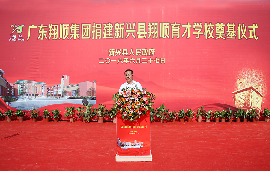 翔順集團(tuán)常務(wù)副總裁鐘世雄致辭。鐘總提到,十年樹木,百年樹人;百年大計(jì),教育為本。翔順集團(tuán)深知興建翔順育才學(xué)校對(duì)推動(dòng)我縣義務(wù)教育均衡發(fā)展、創(chuàng)建宜居城市、構(gòu)建幸福新興具有重大而深遠(yuǎn)的意義,是一項(xiàng)功在當(dāng)代,利在千秋的惠民舉措。2017年7月,經(jīng)縣政府批準(zhǔn),翔順集團(tuán)捐資5000萬元支持新興縣翔順育才學(xué)校的建設(shè)工作。