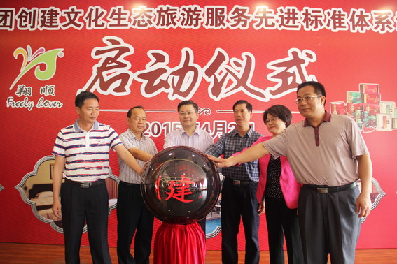 廣東省質監局、廣東省標準化研究院、云浮市委市政府、云浮市質監局、新興縣委縣政府、新興縣質監局等政府部門領導出席儀式。張燕飛、梁偉豪、陳靜香、莫燦輝、陳啟雄、崔健平等6位領導共同為項目啟動球按下啟動按鈕,宣告翔順集團創建文化生態旅游服務先進標準體系試點項目正式啟動。