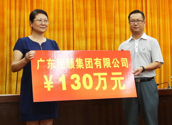 6月30日,在第六個廣東省“扶貧濟困日”新興縣捐款活動現場,集團副總裁鐘世雄(右)代表集團捐資130萬元。