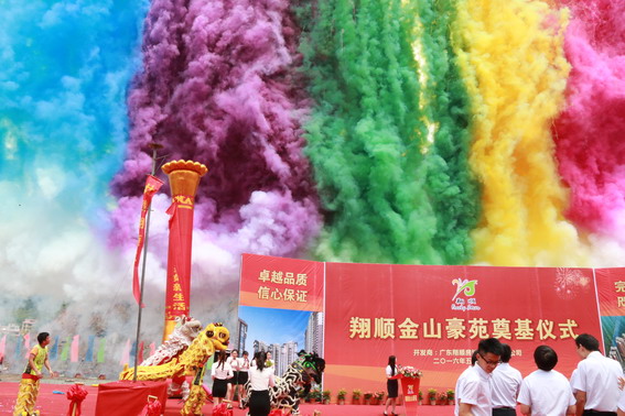 當天上午,云浮市環市中路188號云浮新世紀廣場旁地塊鑼鼓喧天、醒獅舞動,金山豪苑項目奠基議程逐項進行。首先云浮市新世紀廣場物業管理有限公司董事長張文先生和集團總裁助理鄺紹榮進行了項目交接;緊接著,集團總裁崔健平,集團副總裁崔健全、鐘世雄,房地產公司總經理耿志新、副總經理蔡韶銘等6位領導分別為6頭醒獅點睛和掛紅,集團總裁崔健平、總裁助理鄺紹榮進行“接財”;隨后崔健平、崔健全、鐘世雄、潘錦基、崔健鋒、鄺紹榮、崔仲昌、耿志新、陳彬、蔡韶銘、勞志鴻等集團領導以及王維敬、張文等嘉賓領導一同為項目培土,奠基儀式各項議程緊湊有序、莊嚴隆重。隨著皇家禮炮和七彩禮炮的鳴放騰空、奠基儀式圓滿完成。